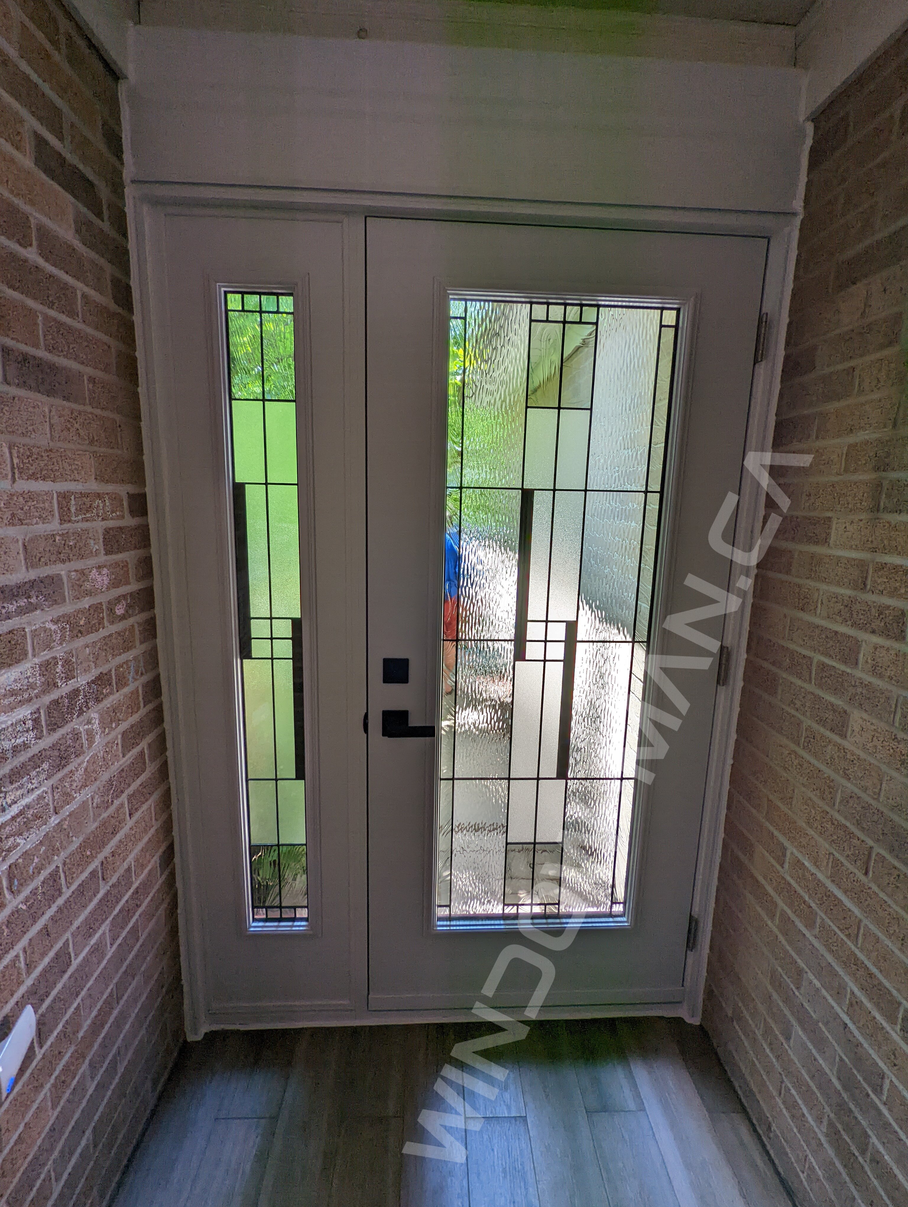 This Aztec Red steel door with sidelight creates a strong and distinctive entry. In homes around Richmond Hill, it works well where you want the entrance to stand out while still keeping a clean and structured look. The full Santa Fe stained glass adds color and detail, allowing natural light into the space while giving the door a more decorative appearance. The sidelight extends the glass area, helping the entry feel brighter and more open.