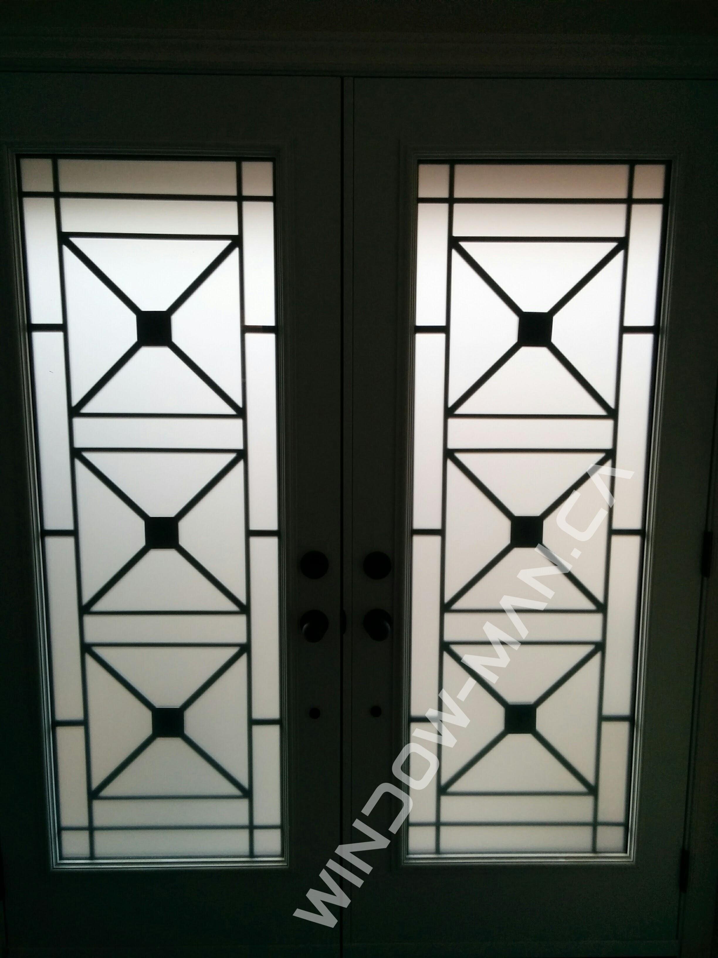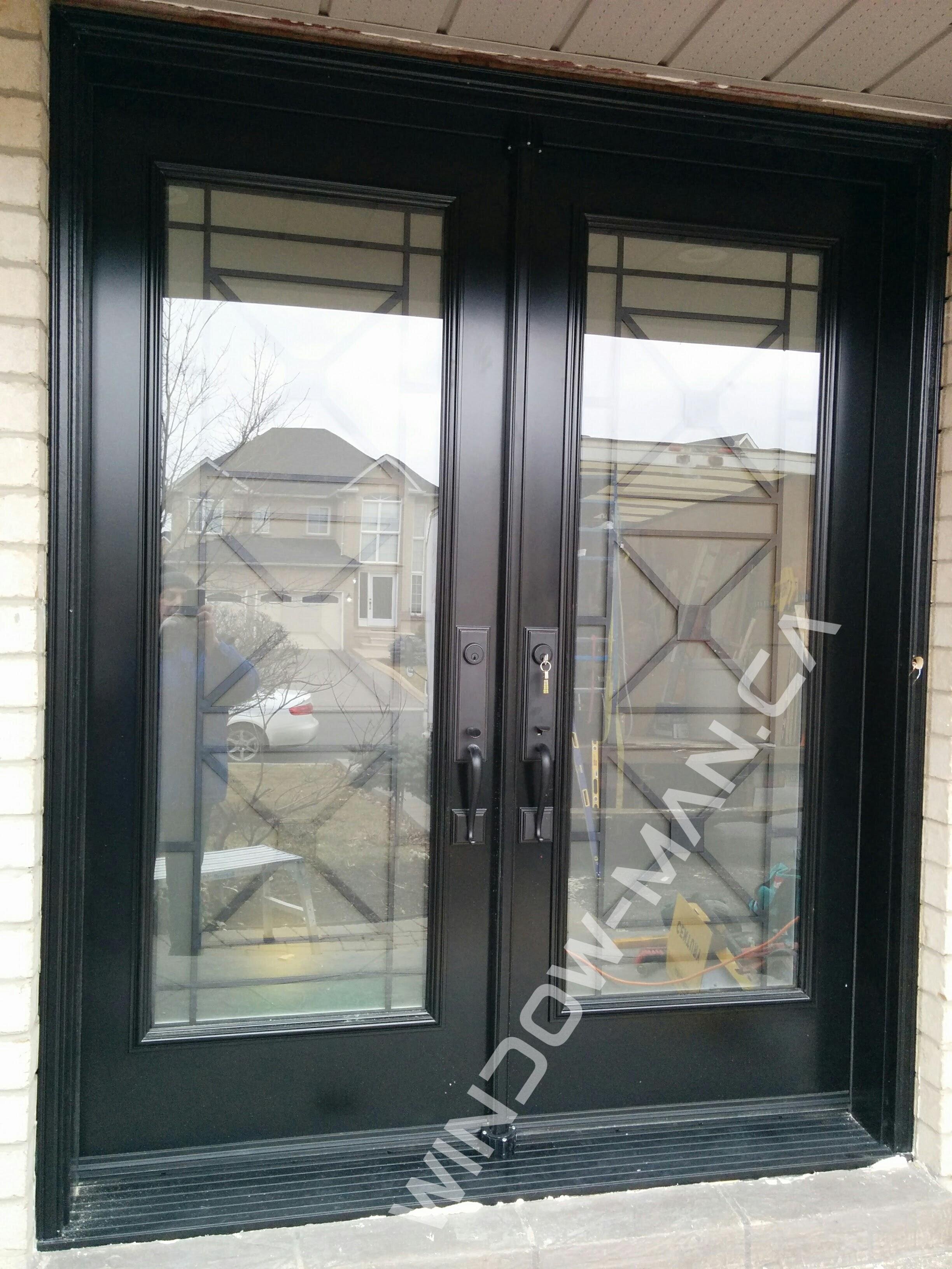 These double black doors create a grand and sophisticated entrance, featuring full-length Century wrought iron glass inserts (22x64). The painted finish. Measuring 66x82, these energy-efficient doors offer both exceptional beauty and lasting durability.