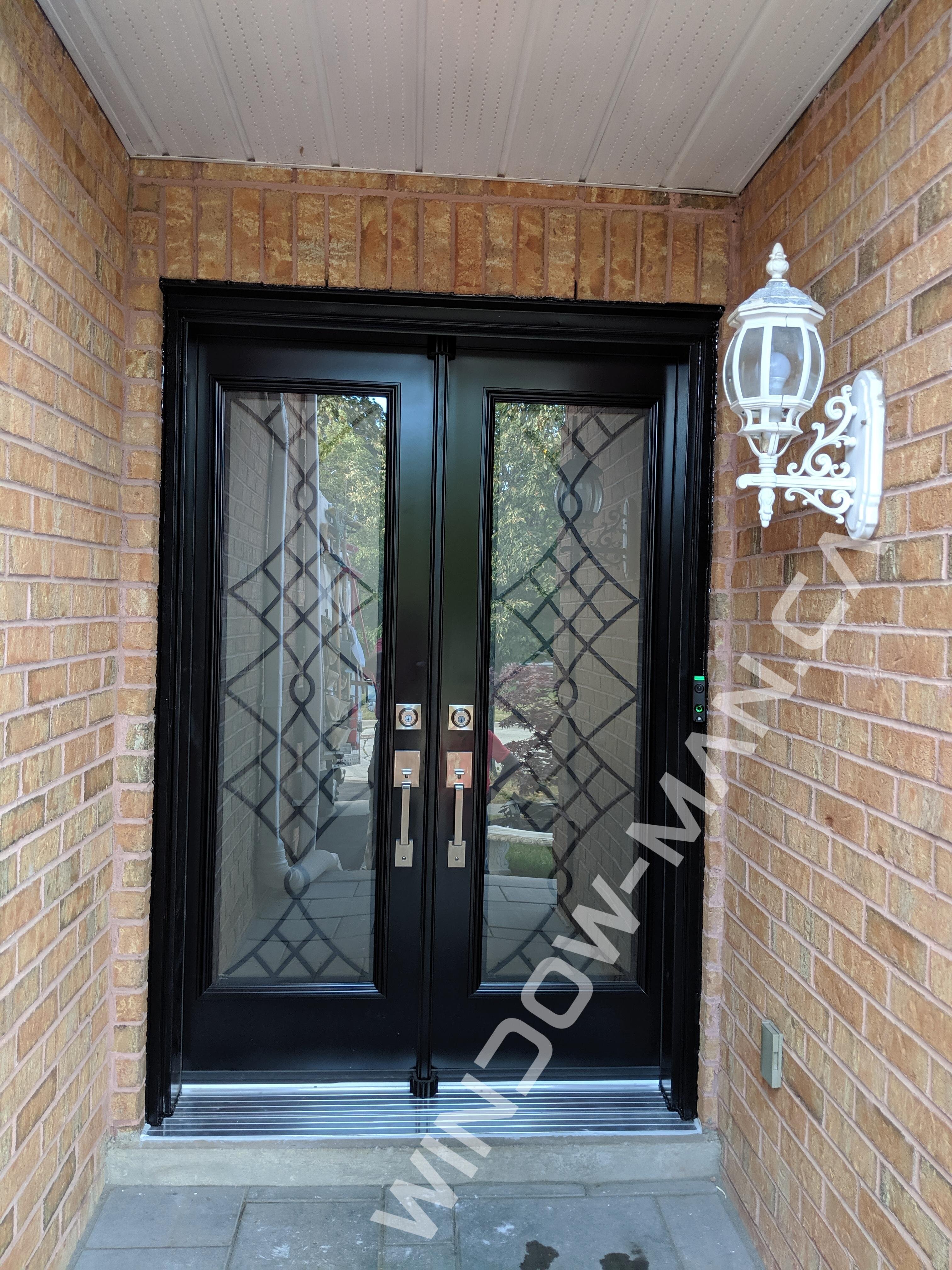 These double black outside doors create a striking, yet space-conscious entrance with full-length Oak Ridge wrought iron glass inserts (18x64). The painted finish enhances the modern aesthetic. With a narrow width of only 26 inches per door, these 54x81 energy-efficient doors are an ideal solution when space is limited, but style is paramount. The wrought iron detailing adds a classic, elegant touch, while.