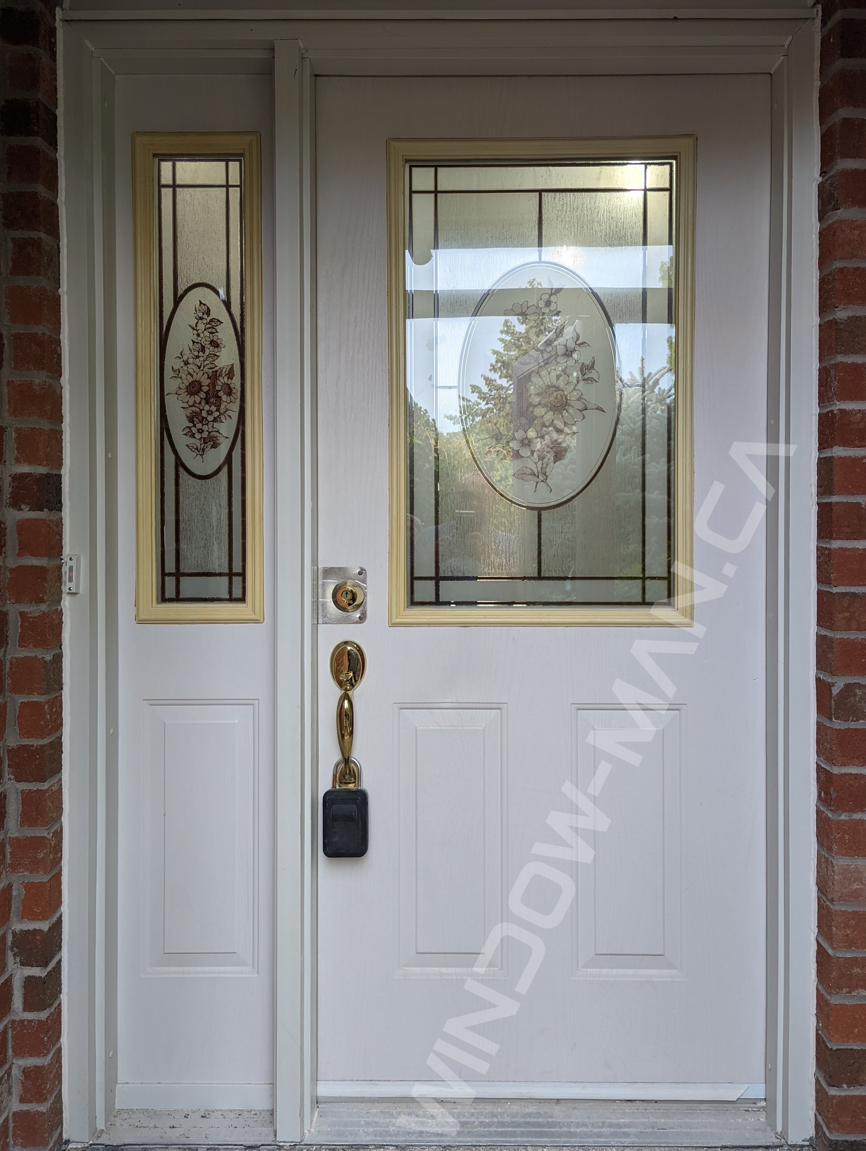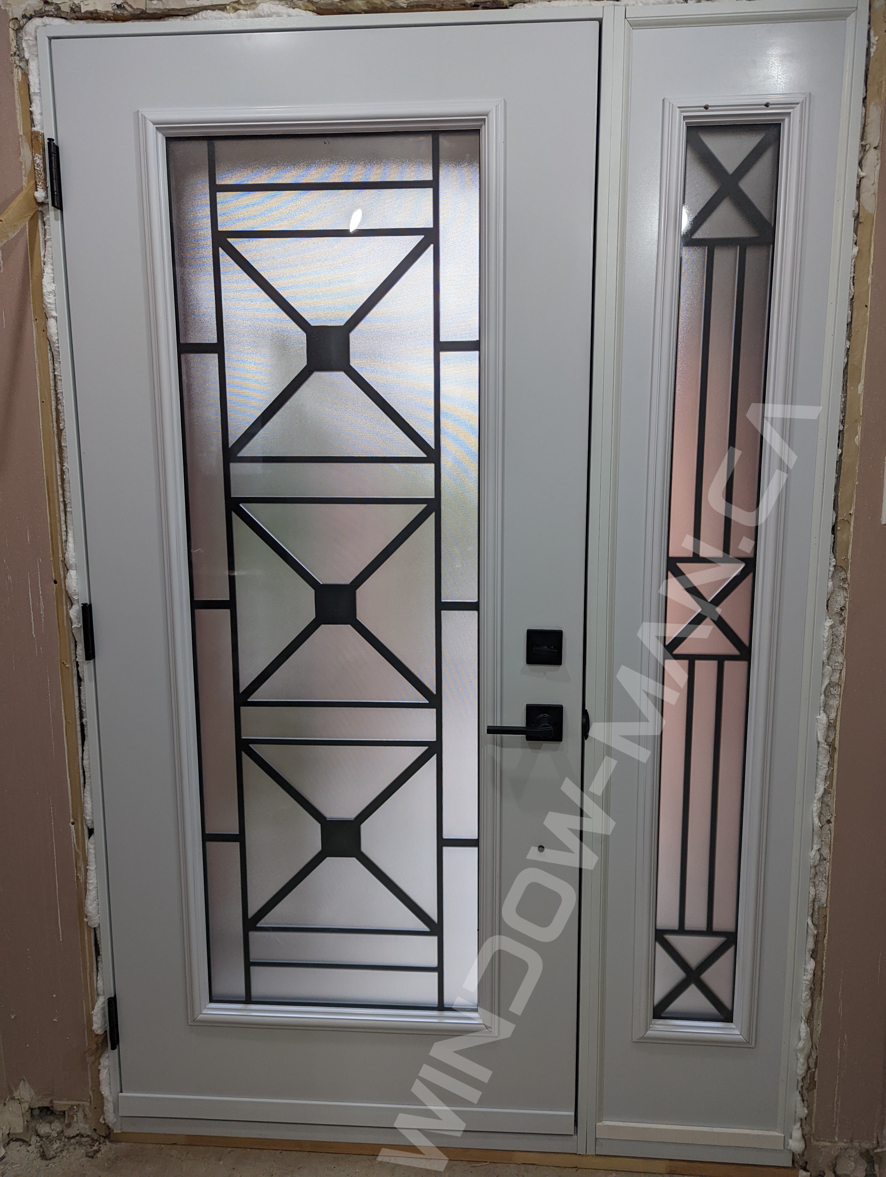 This black steel door with sidelight features a contemporary design with full Century wrought iron glass. In homes around Mississauga, it works well as a front entrance where you want both natural light and decorative detail.