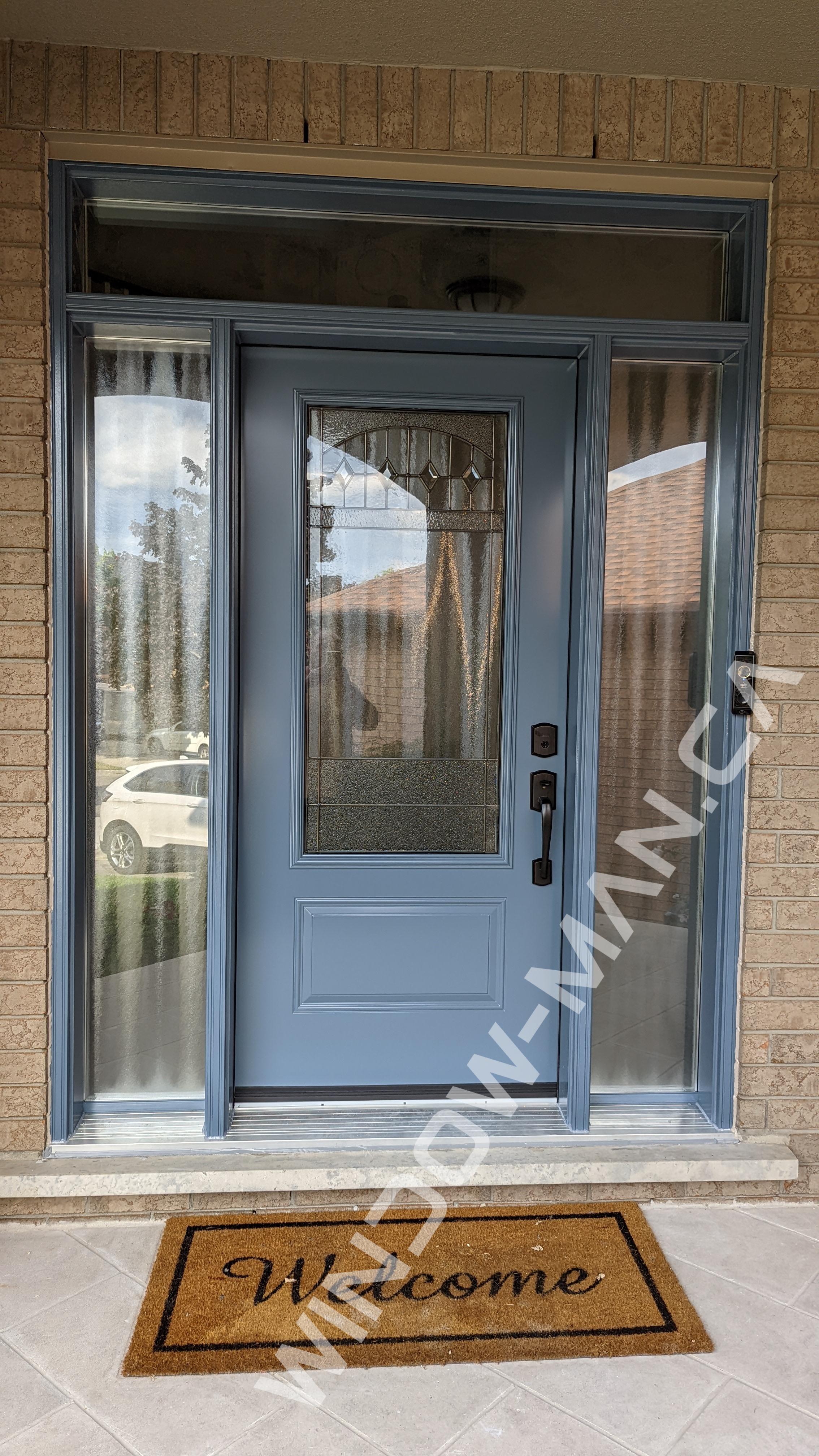 This Wedgewood Blue front door colors with sidelights and a transom creates a stunning and welcoming entrance with its Liano 3/4 stained glass insert (22x48) and wide sidelight. The painted finish offers a unique and refreshing look. This energy-efficient door combines artistry, natural light, making a grand impression, two-panel. The inclusion of a transom further.