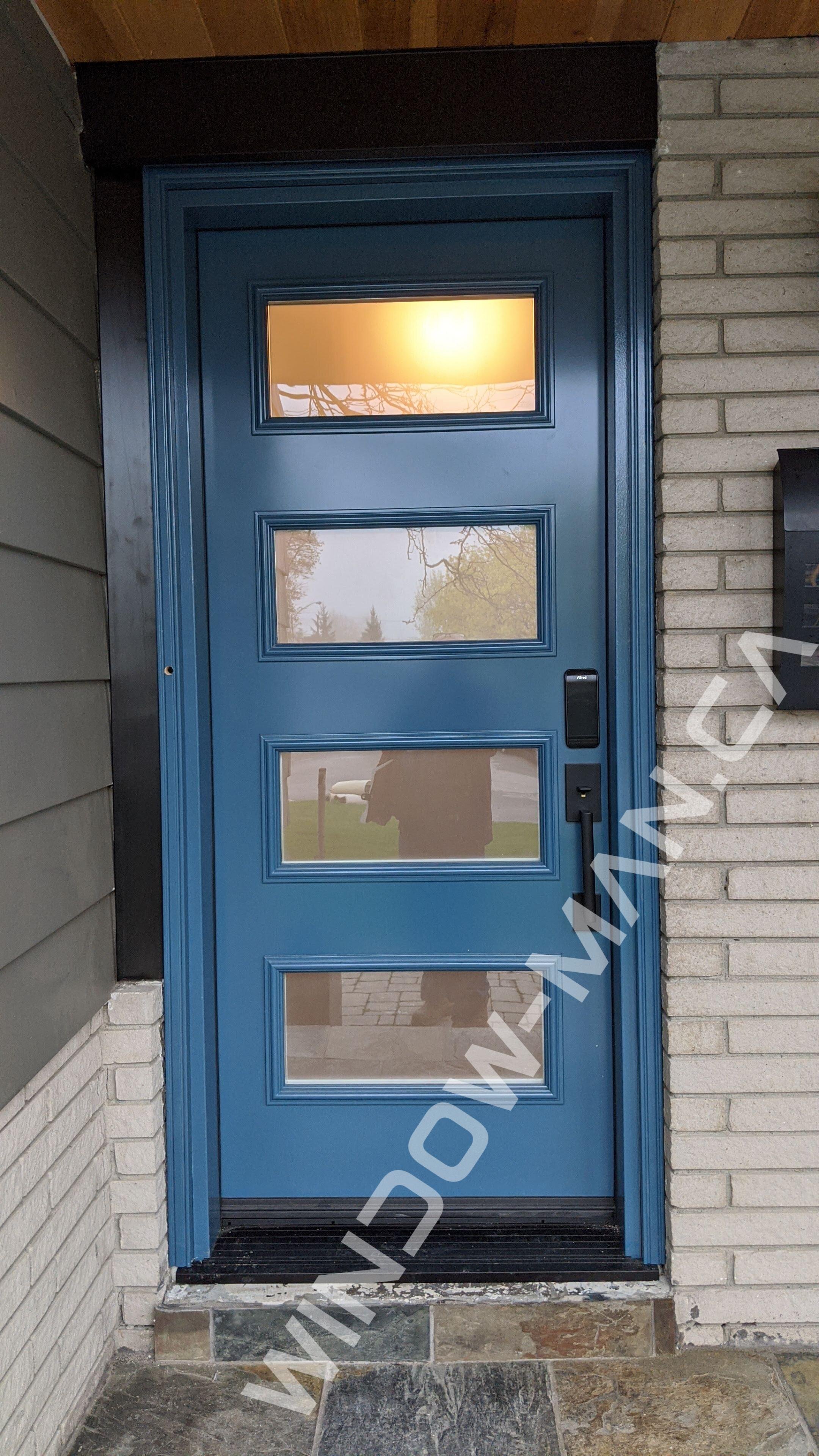 This single blue front door in Coastal Blue features a Shaker acid-etched glass insert (22x10), offering a modern, minimalist aesthetic. The painted finish provides a pop of color. This energy-efficient door includes a smart lock for added security and convenience. The sleek design and durable construction.
