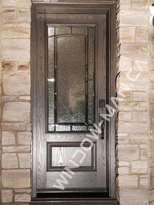 Front Door Fiberglass Single in Nutmeg with Malibu 3/4 Wrought Iron Glass with 3 Point Lock Oak grain