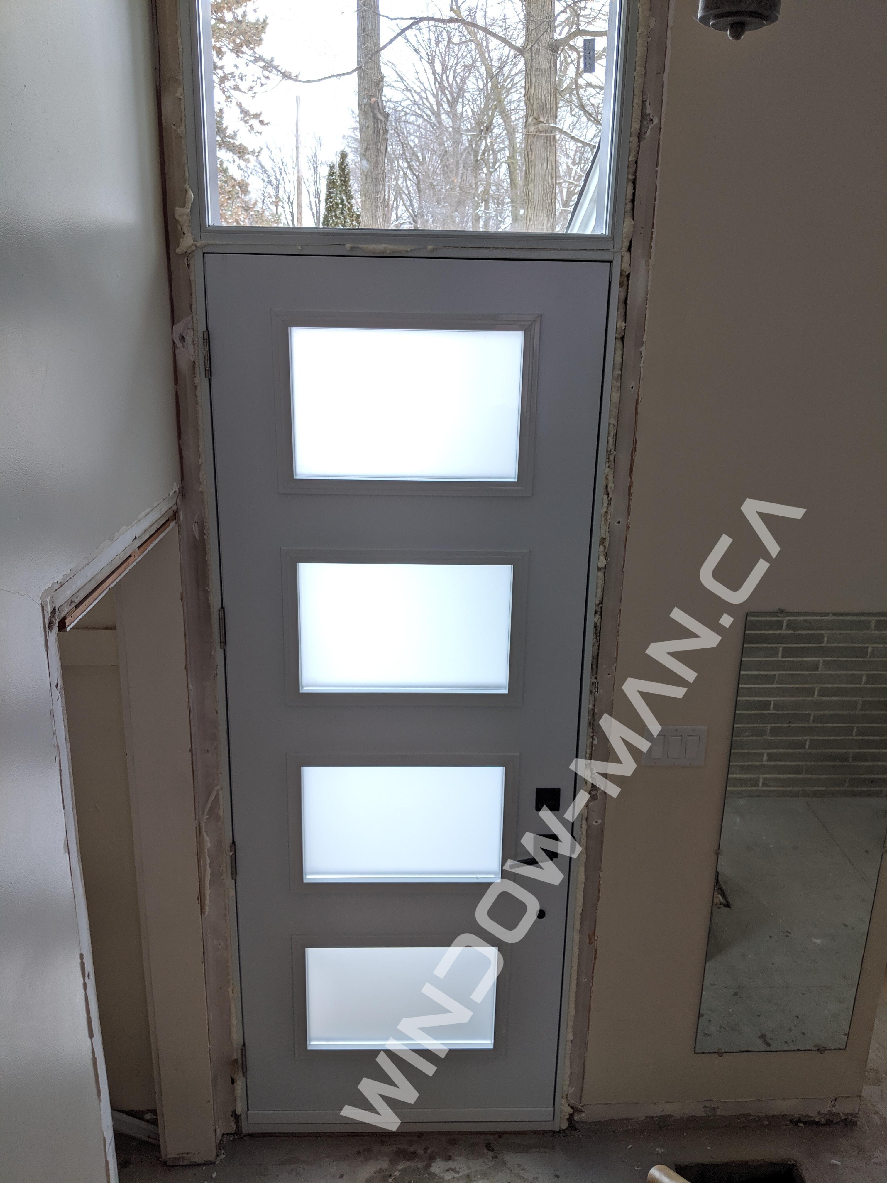 Three-Panel-Door with Sidelights in White Shaker Acid Etched Glass Wide sidelight, triple door