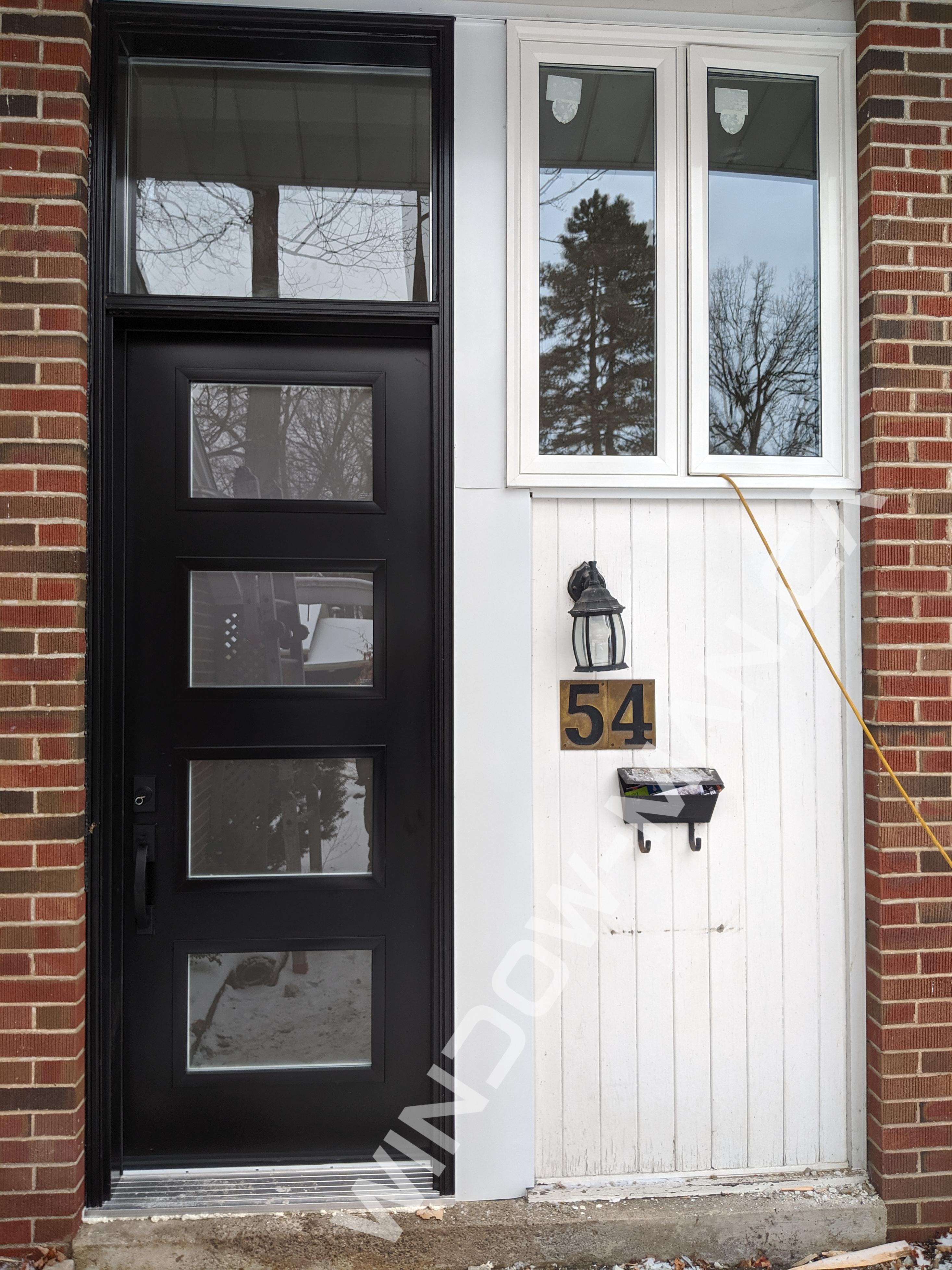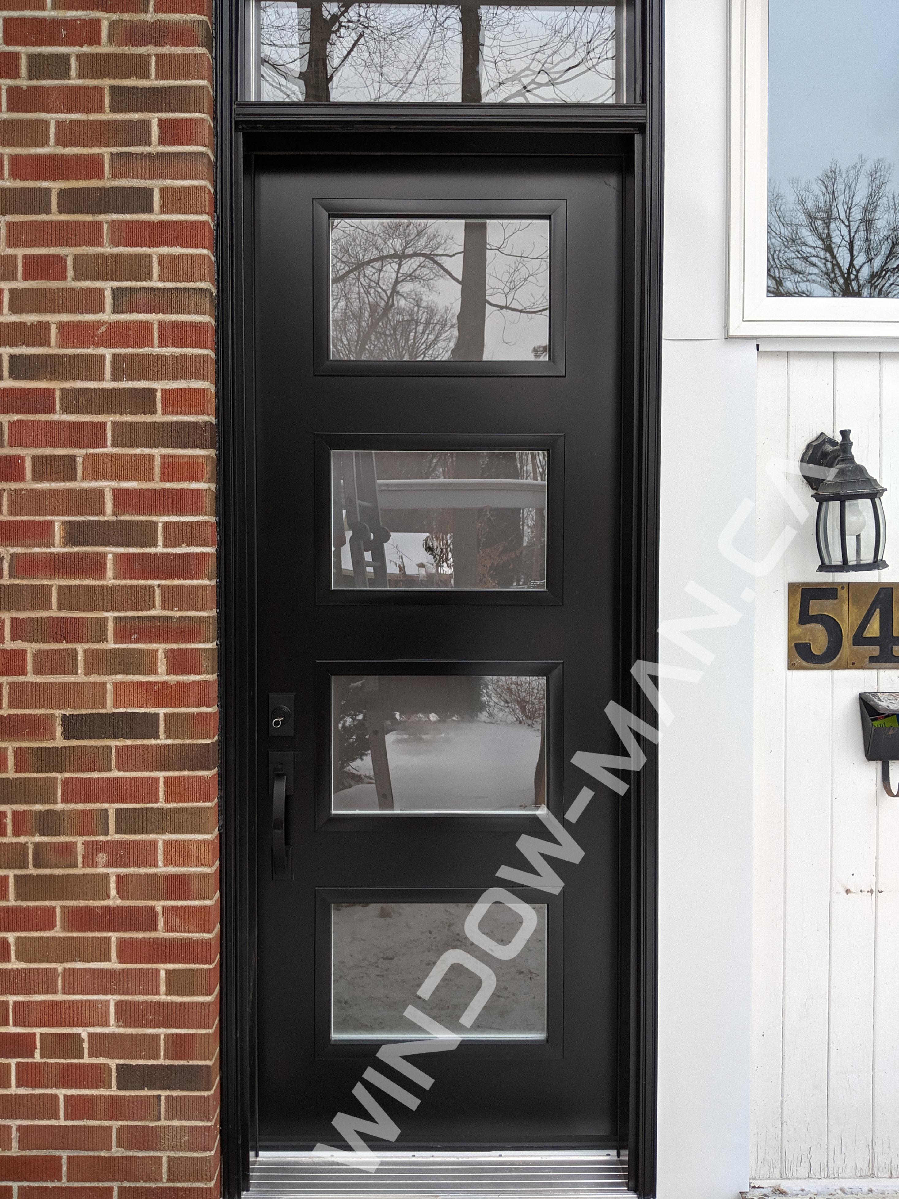 This black exterior french doors Canada feature a Shaker obscure glass insert (22x14) and a transom, offering a modern and stylish design with enhanced privacy. The painted finish complements. Standing at an impressive 8 feet tall, this energy-efficient door, with Frame Size Width x 128" overall dimensions, creates a grand.