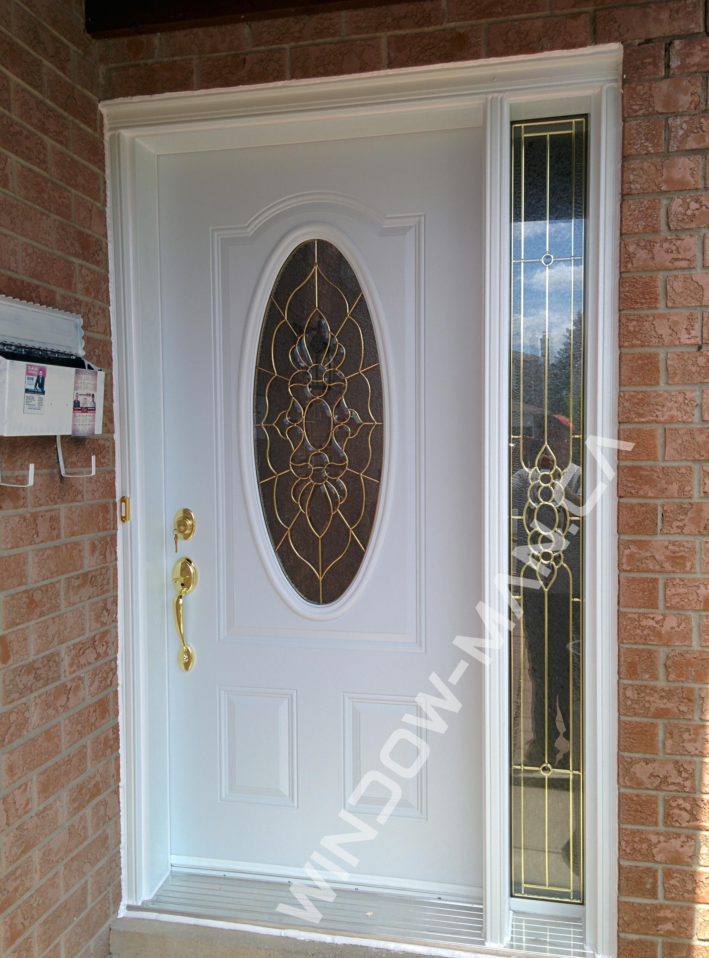 This exterior steel door with sidelight showcases a Peterborough 3/4 oval stained glass insert (15x39) with brass caming, adding a unique, artistic touch. The factory white finish offers versatility. With a frame size of 48x80, this energy-efficient door creates an elegant front entryway, features three-panel design.