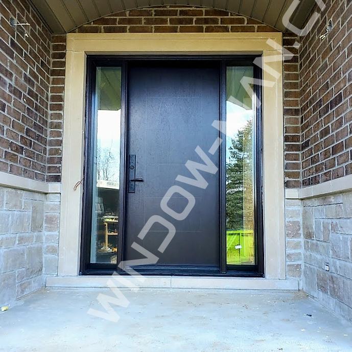 Fiberglass Modern Front Door with Sidelight in Black with Pull Bars Mahogany grain, wide 40 inch, aluminum stripe design