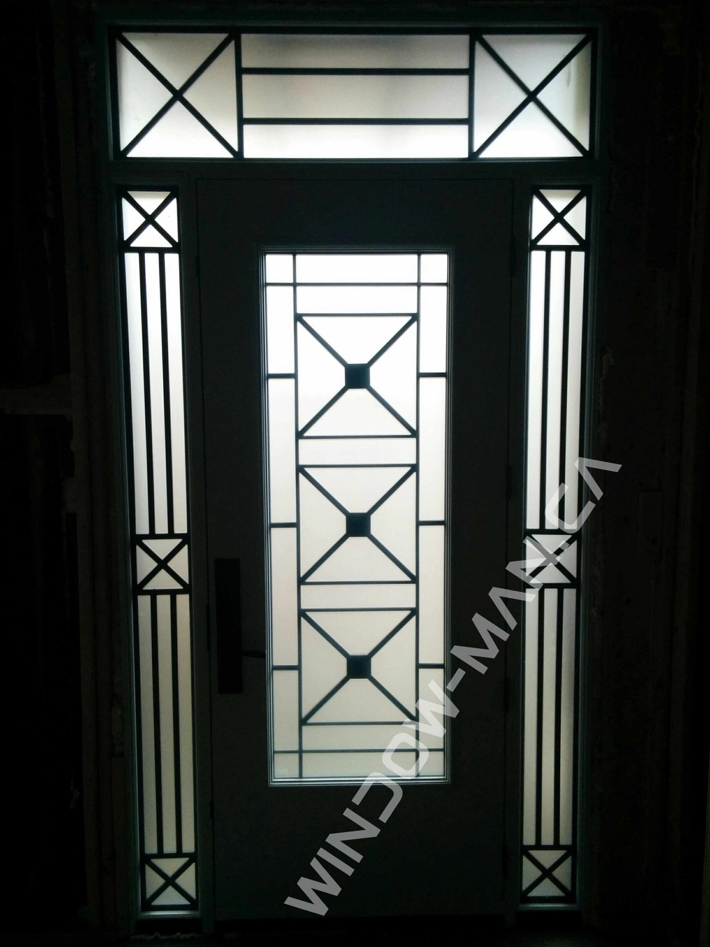 This black front door with sidelights and transom creates a truly grand and imposing entrance, featuring full-length Century wrought iron glass inserts (22x64), an 8-foot height, and a multipoint locking system. The painted finish. Measuring 54.5x120, this energy-efficient door system offers exceptional security. The combination of expansive glass, wrought iron.