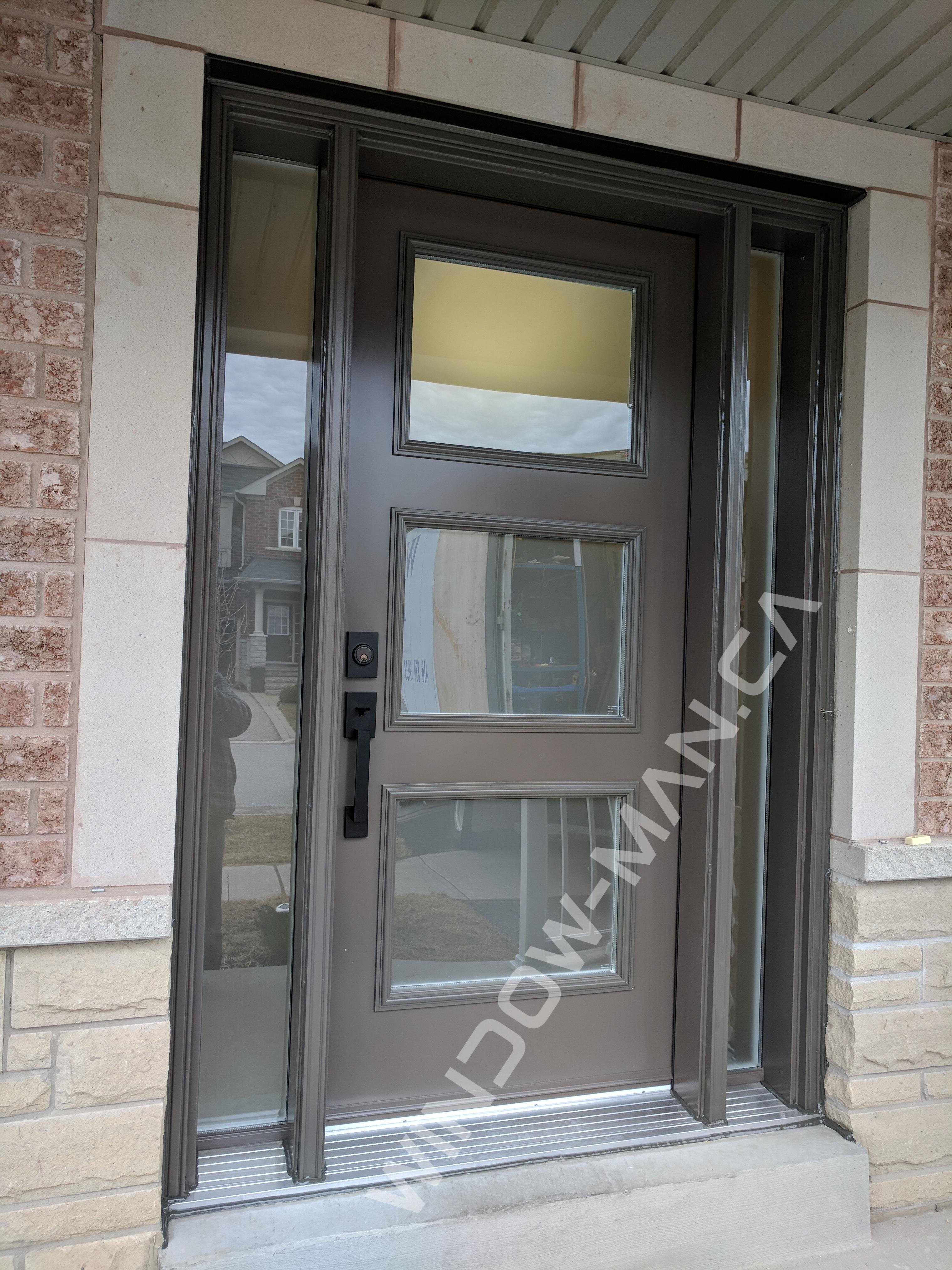 This Windswept Smoke modern front door with sidelights offers a contemporary and stylish entryway with Shaker frosted glass inserts (22x17). The painted finish. Measuring 54.5x80, this energy-efficient door system provides both privacy and natural light.