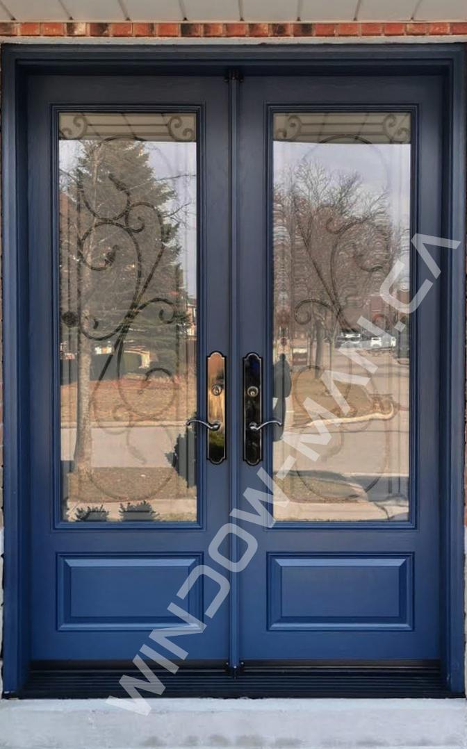Blue Front Doors Double in Old World Blue with Malibu Full Wrought Iron Glass with Matching Transom