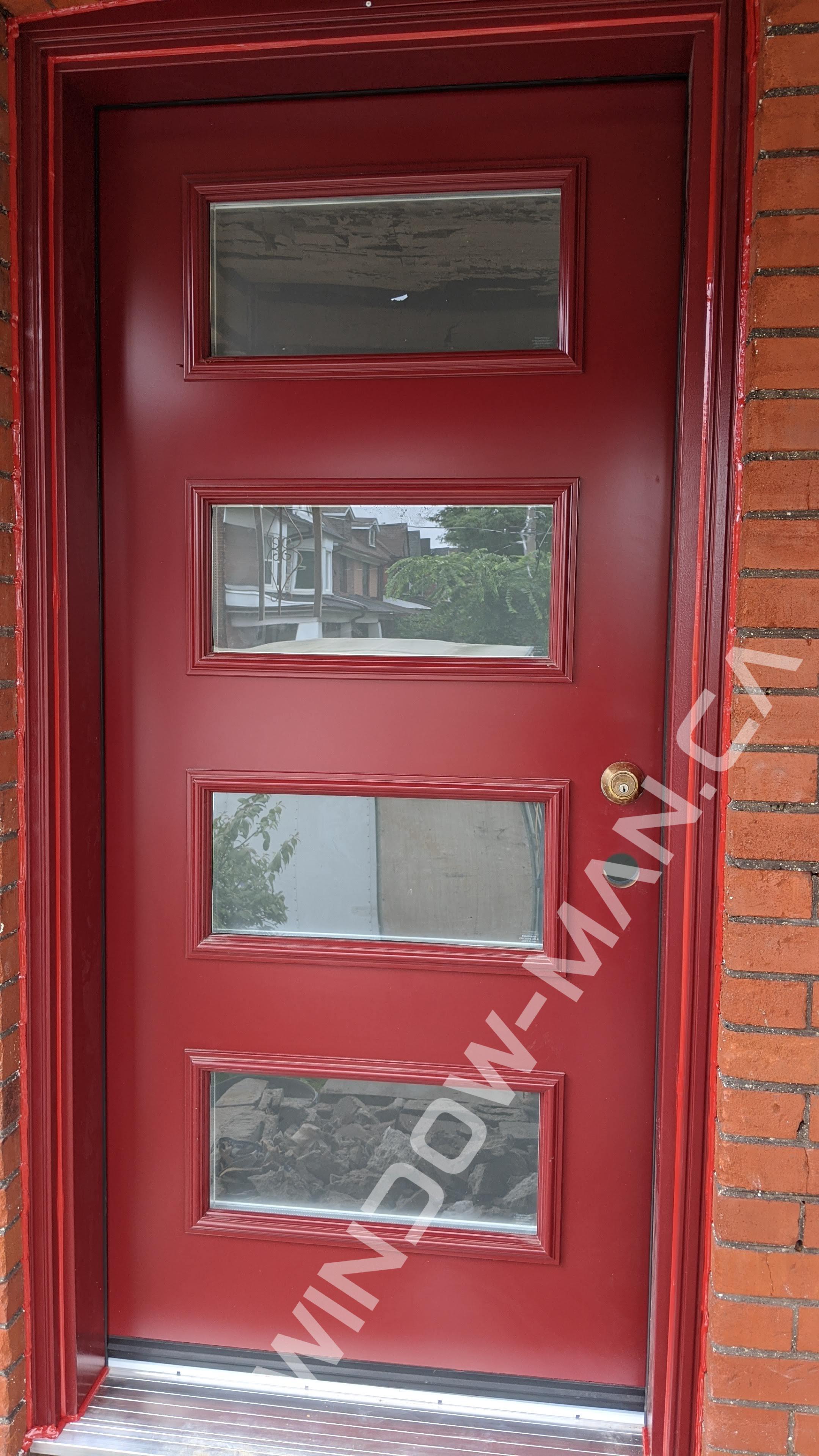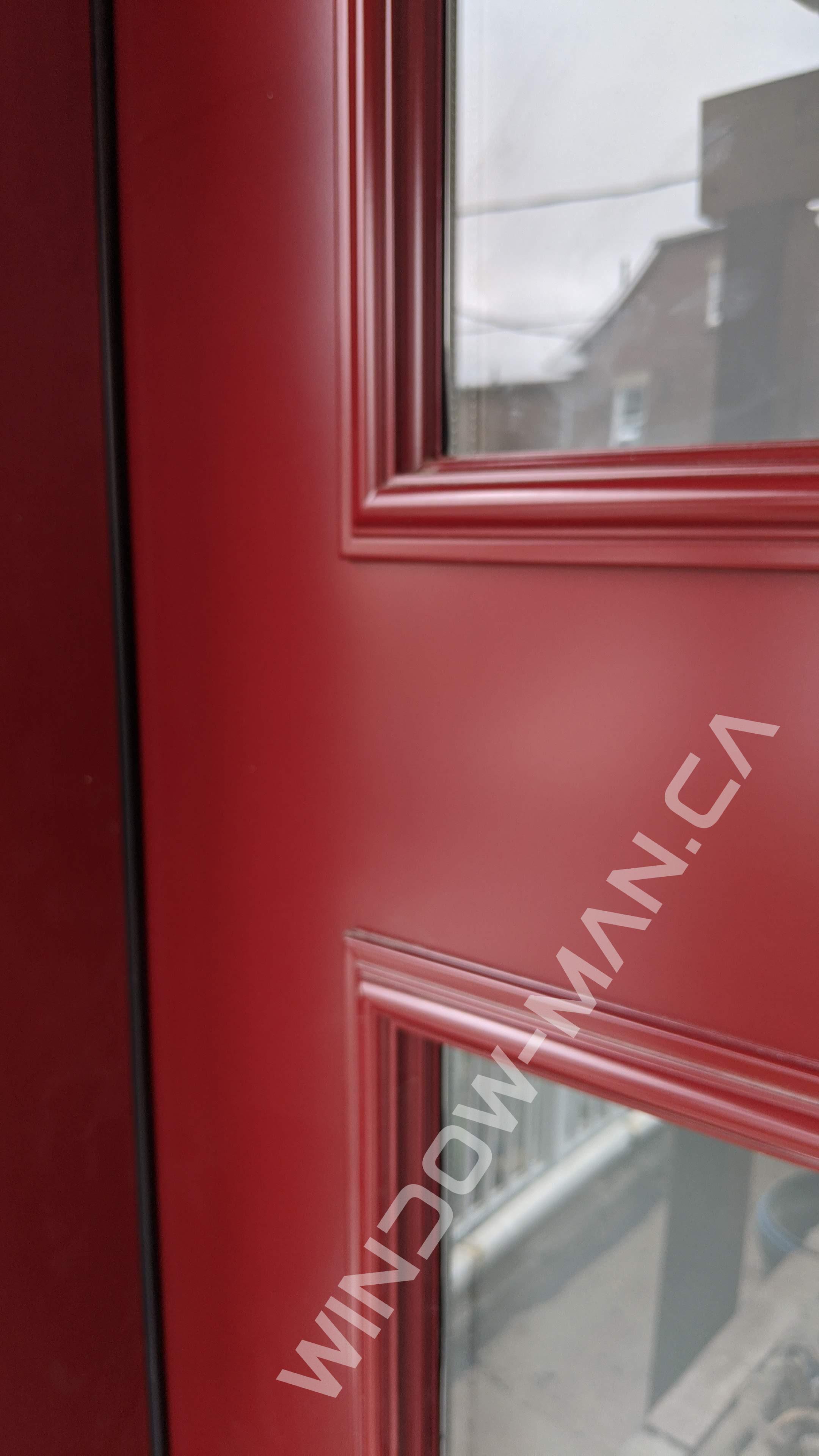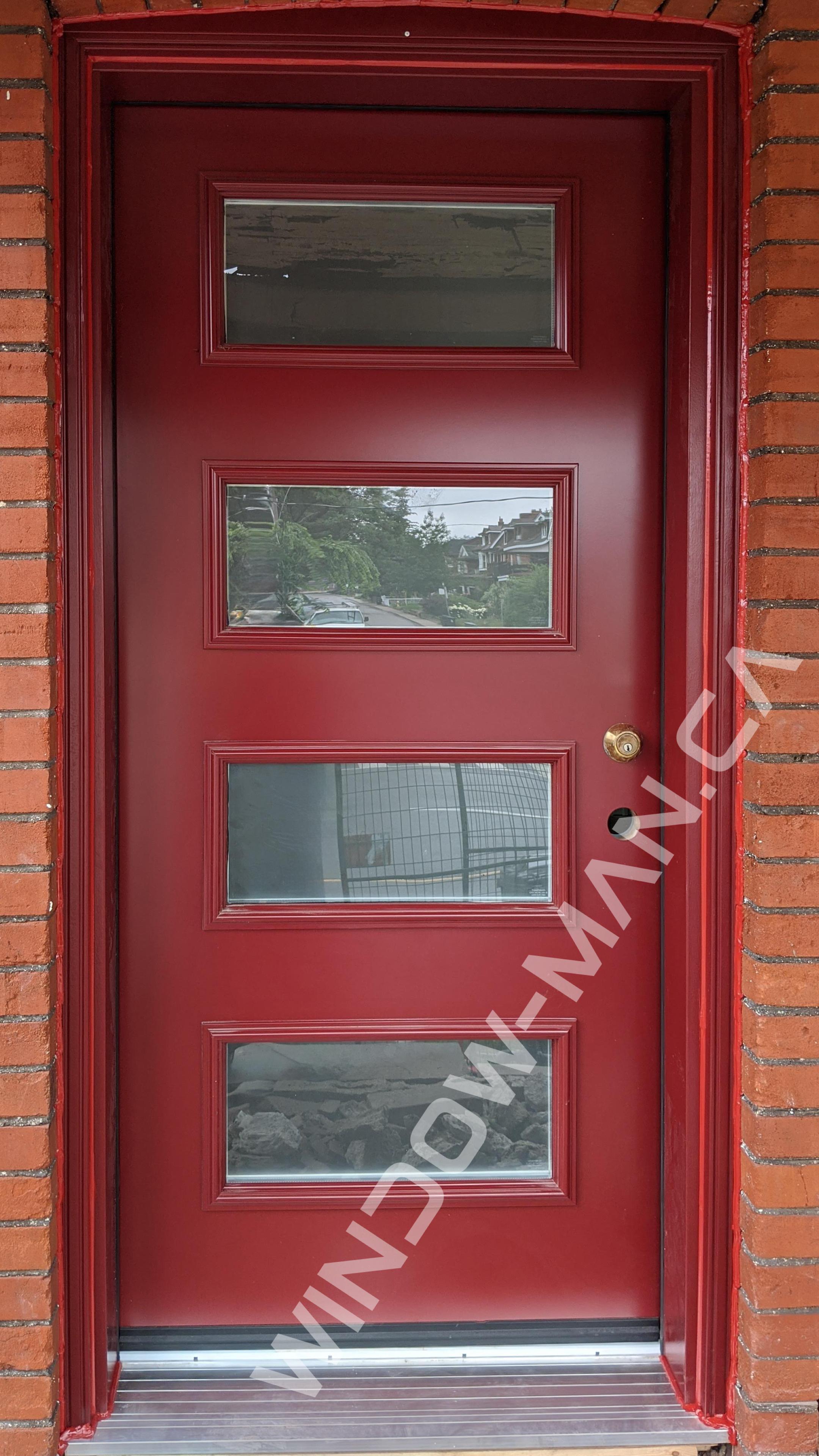 This Aztec Red door features a Shaker acid-etched glass insert (22x10), making a bold and stylish statement. The painted finish offers a vibrant pop of color. This energy-efficient door is designed for durability and modern appeal.