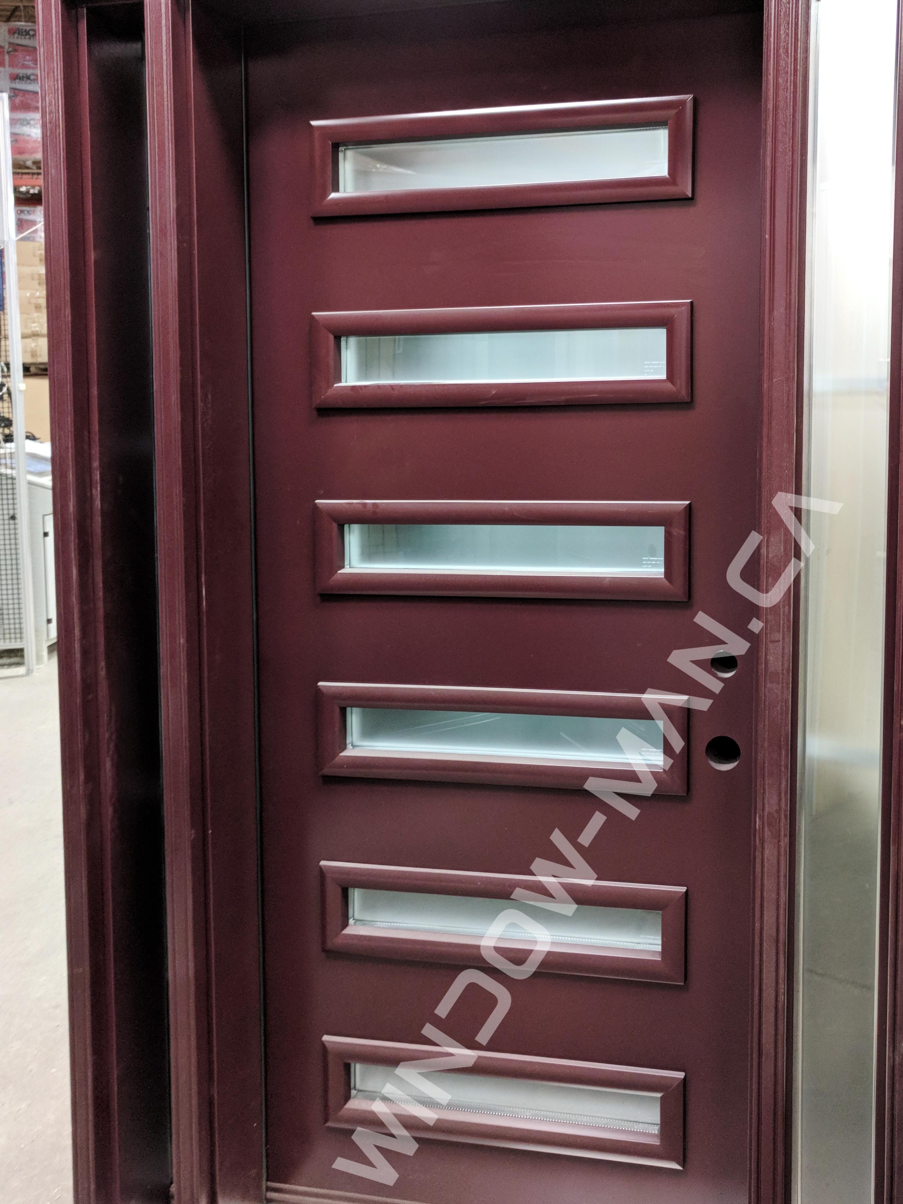 This Burgundy red entry door with sidelights makes a bold and sophisticated statement with Shaker sandblasted glass inserts (22x5). The painted finish. Measuring 37.5x80, this energy-efficient door system combines visual appeal with enhanced privacy.