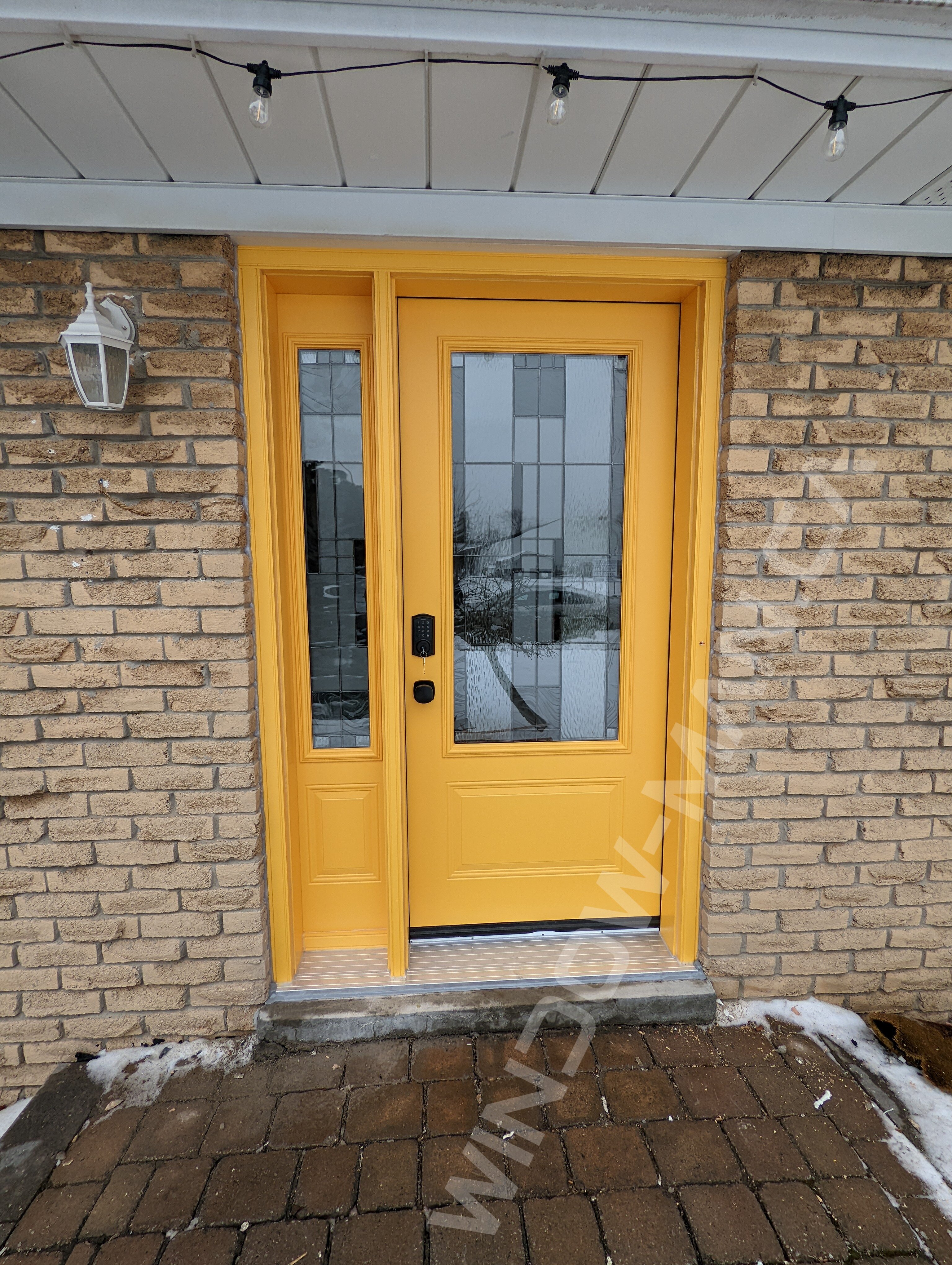This yellow steel door with sidelight creates a bright and distinctive entry. In homes around Whitby, it works well where you want to add character and make the entrance stand out. The 3/4 Santa Fe stained glass adds color and detail while still allowing natural light into the space. The sidelight extends that effect, helping the entry feel more open and welcoming.